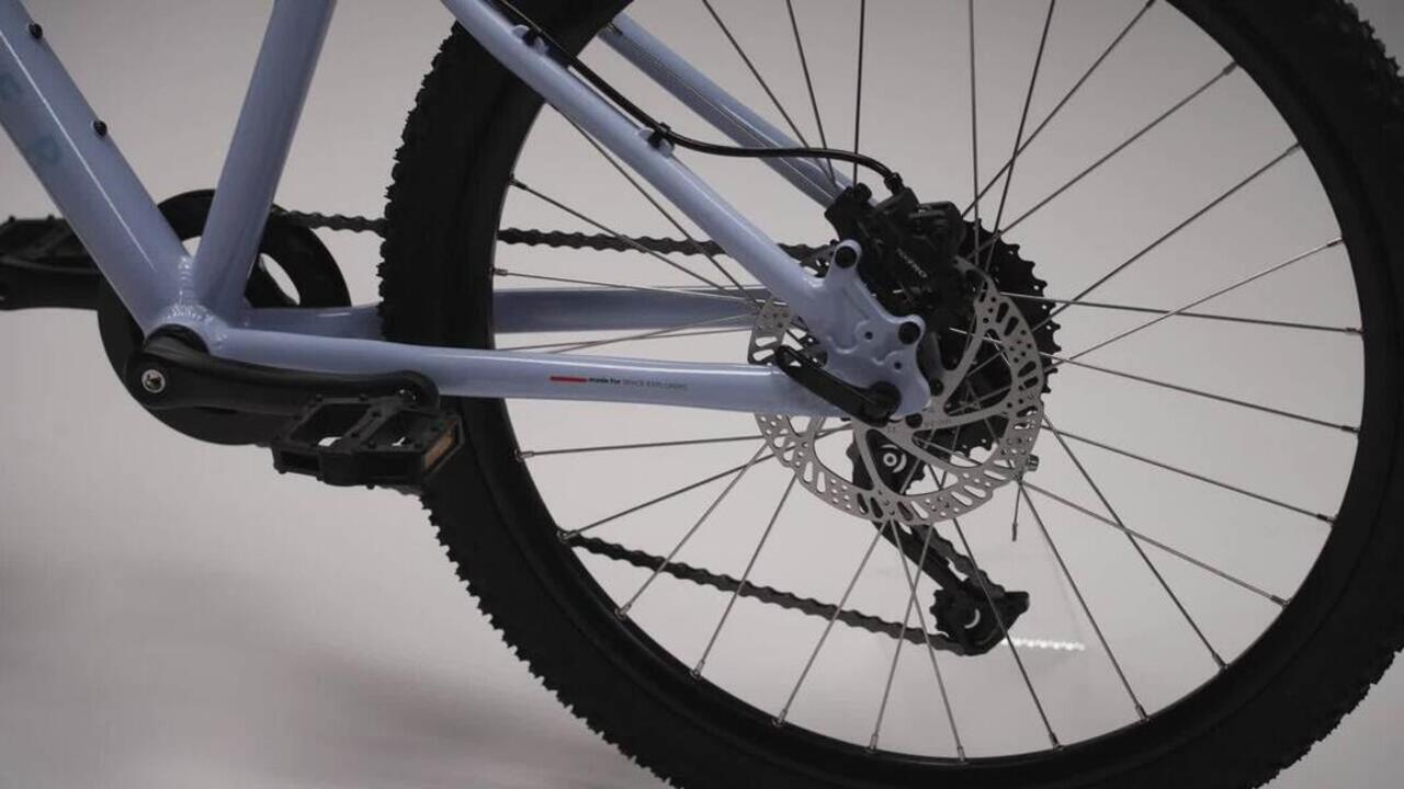 Comme l’impose la norme, ce VTT est équipé d’une sonnette, d’éclairages, de catadioptres de roues (réflecteurs) et de pédales plates.